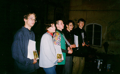 A to jsou členové vítězného družstva s diplomy a originál vrcholovými pohlednicemi v rukou. Zleva: Bobek, Petra, David, Bob, Flix.