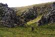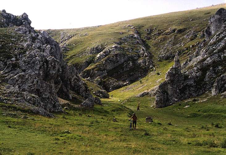 Pohled ze sedla 1434 m (waypoint S2) přes bezodtoké údolíčko V.S. Merci do sedla Guado di