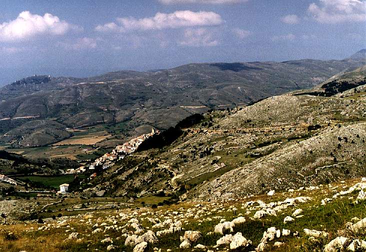 popředí je vlevo vidět druhý hřeben se středověkým hradem Rocca Calascio (1458 m)